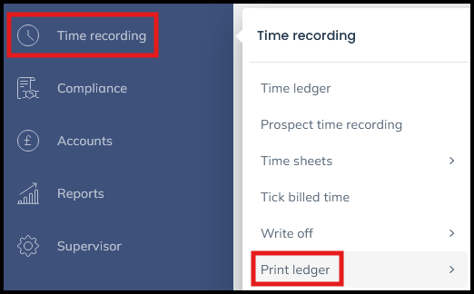 Load your required client and navigate to Time recording > Print ledger