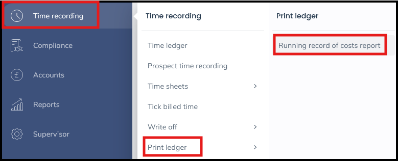 To produce this report, go to Time recording > Print ledger > Running record of costs report.