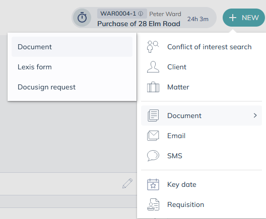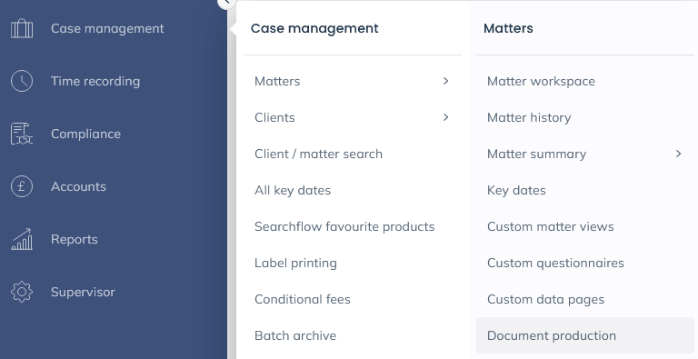 To produce a document, load the relevant client, then navigate to Case Management > Matters > Document Production. Or go to the +New Button > Document > Document.