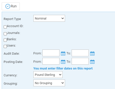 - Audit Date Filters – Enter the date range you want to report on here. The audit date is the date you actually made the posting. A date range for either posting date or audit date must be entered.