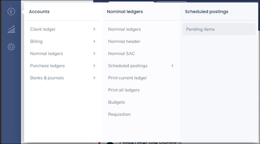 If there are outstanding postings scheduled for this period, select ‘Nominal Ledgers’ from the left hand menu. Select ‘Accounts’ then ‘Nominal ledgers’, ‘Scheduled Postings’ followed by ‘Pending items’.