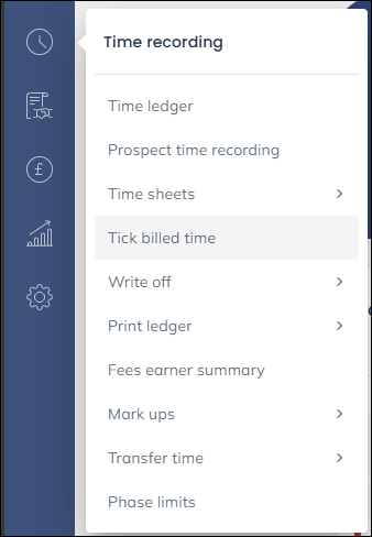 If there are deferred bills awaiting ticking select ‘Time Recording’ from the left hand menu, followed by ‘Tick Billed Time’.