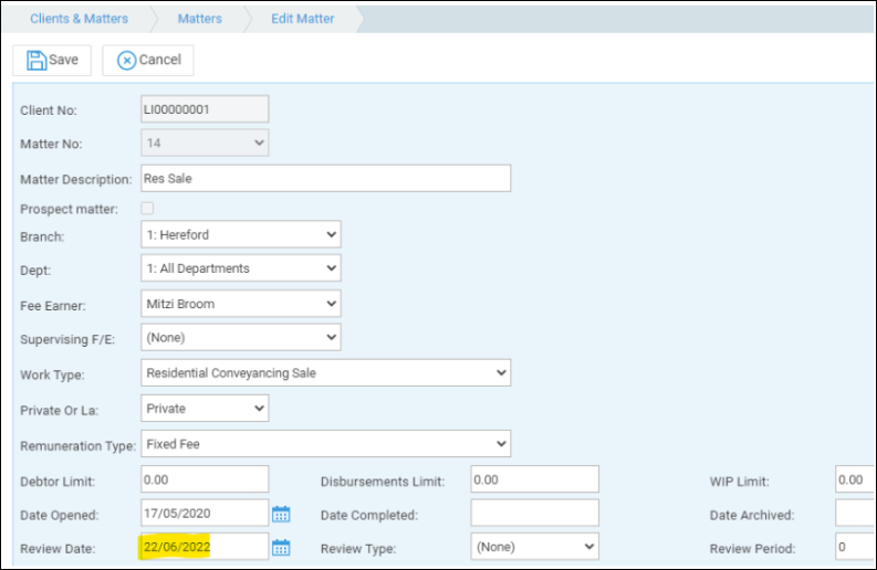 e.g. If you have a matter with a Last Movement Date (LMD) of 05/03/2022 and today’s date is 05/06/2022 and the Review Period is set to 90, a reminder will be displayed, as it is longer than 90 days since the matter was worked on. If a Review Period is set and the LMD is blank, a reminder will be displayed.