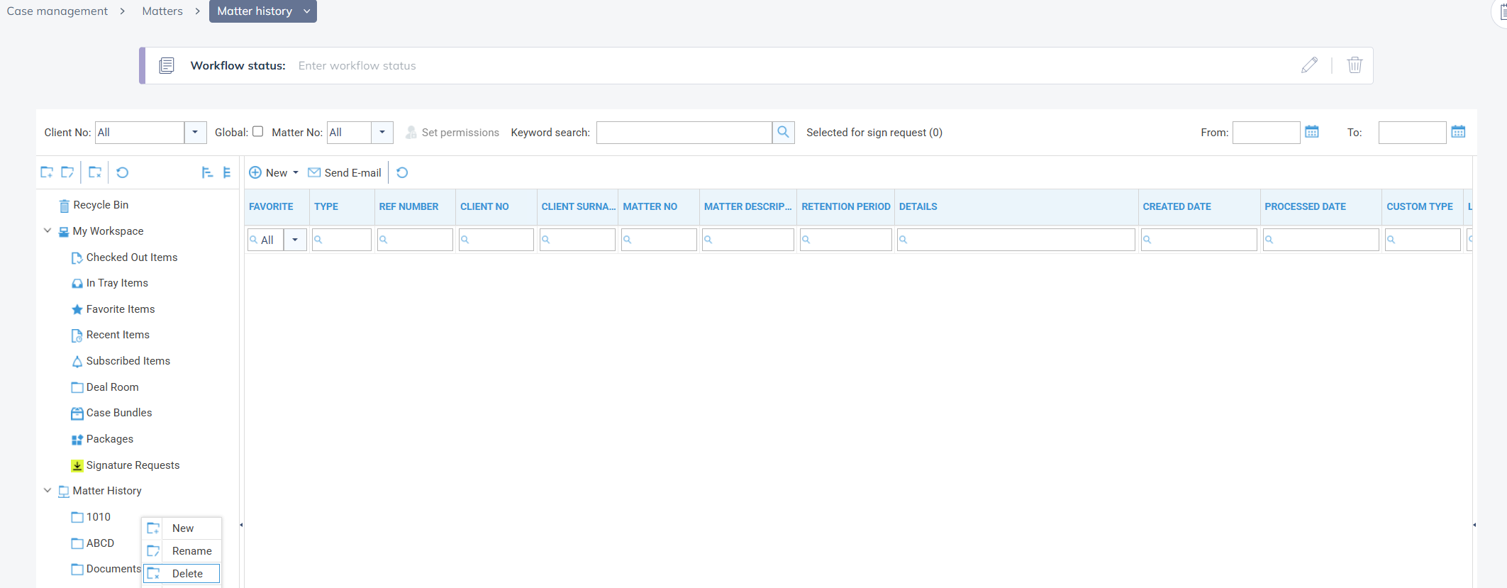 In the case management area, right click the matter history in the My Workspace section and select new. Enter the folder name and click Save. The folder can be renamed if required by right clicking and selecting ‘Rename’.