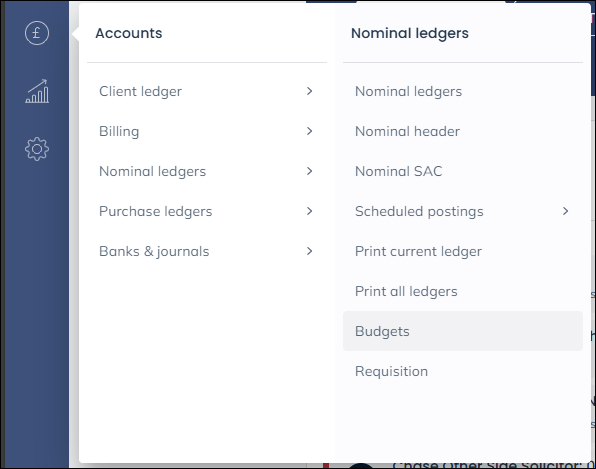 Navigate to the Accounts area, then Nominal ledgers and choose Budgets from the sub menu: