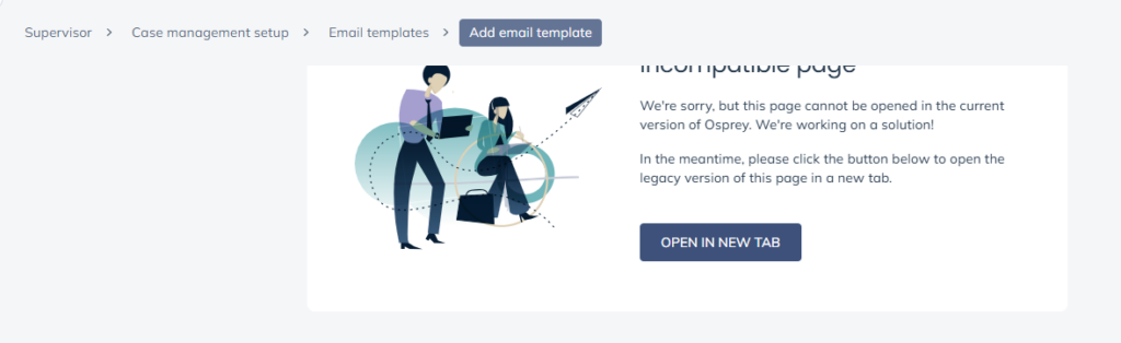 Please note: When creating a new template or editing an existing one, you will see a screen prompting you to click “Open in new tab.” Select this to be redirected to the legacy Osprey site, where you can make the necessary changes.