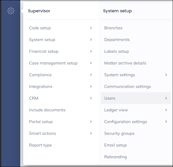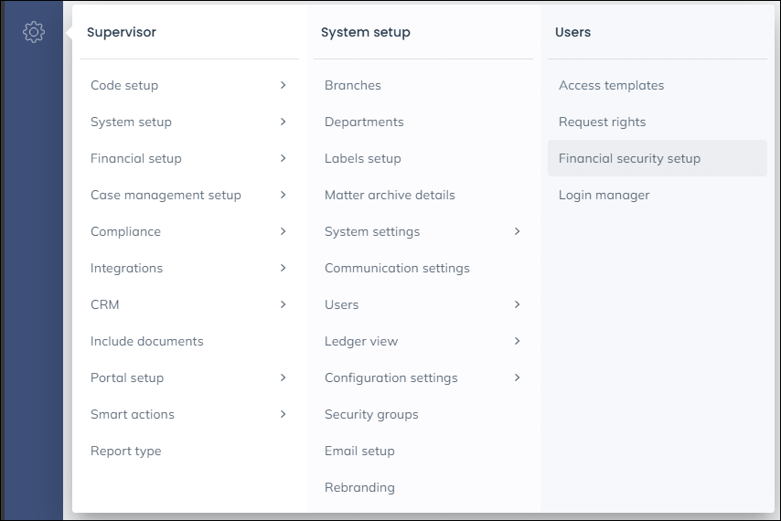 Navigate to Supervisor > System setup > Users > Financial security setup.