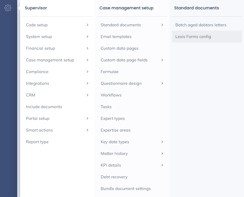 Select the ‘Supervisor’ tab. Then select ‘Case Management Setup’ followed by ‘Standard Documents’ and click ‘Lexis Forms Config’ as shown below.