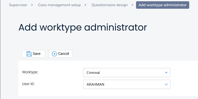 Users can be Questionnaire Administrators for more than one worktype, and more than one administrator can be linked to a worktype.