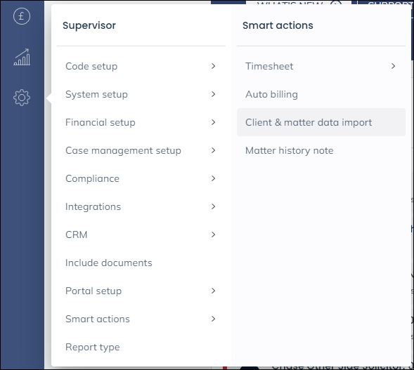Navigate to the ‘Supervisor’ tab and ‘Smart Actions’ then select ‘Client and Matter Data Import’ as highlighted in the screenshot below: