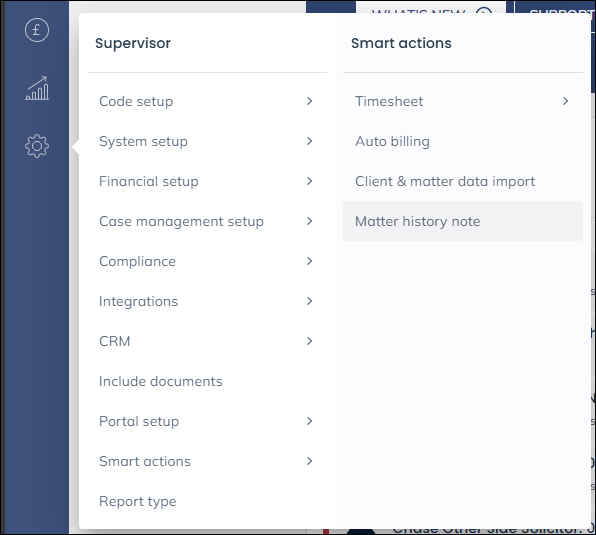 Select ‘Supervisor’, then ‘Smart Actions’ from the side menu and click on ‘Matter History Note’.