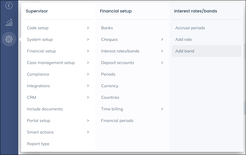 Navigate to the Supervisor area and select Financial Setup. Then click on Interest Rates/Bands. Now choose to Add Band.