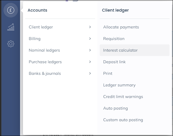 Navigate to Accounts, then Client Ledgers and select the Interest Calculator.
