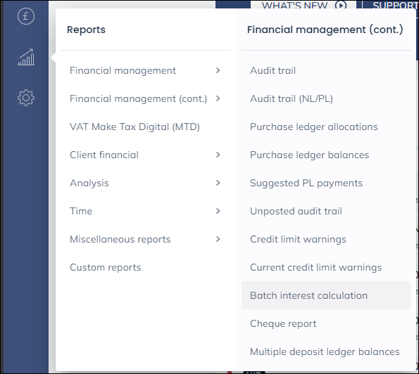 There is also a report available to show the interest due on all matters. Under the Reports tab, navigate to Financial Management (cont.) and then select Batch Interest Calculation.