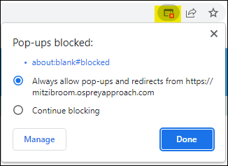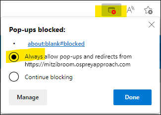 This occurs when your HMRC token has been deleted or does not exist, and pop ups are blocked on your browser. Return to Reports > Financial Management > VAT MTD (Make Tax Digital). Click New VAT Submission and look for the blocked pop ups notification – in Edge and Chrome these will appear at the end of the address bar at the top of your browser. Click this and select Always allow popups and redirects from Osprey.