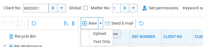This will open the Matter History page. In the Main panel click onto the Arrow Next to the word New, and select Upload