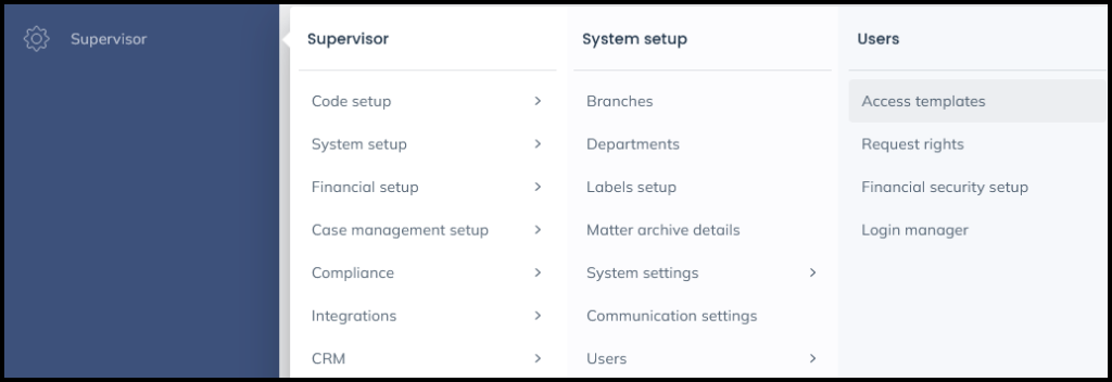 To obtain full access to these areas, navigate to your ‘Supervisor’ tab and select ‘System Setup’. Go to ‘Users’ and then select ‘Access Templates’.