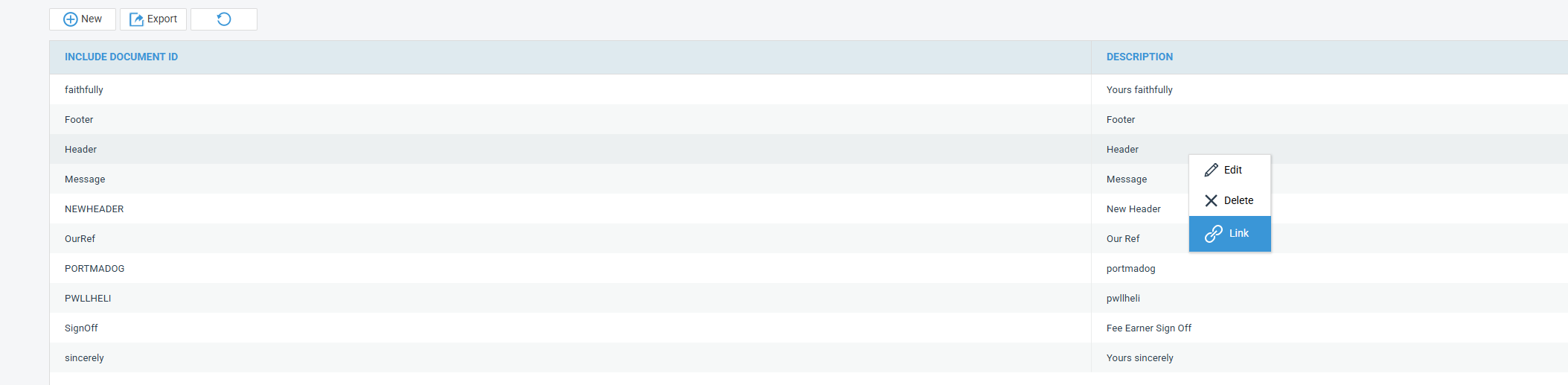 Your new header will now be visible on the Include Document screen.