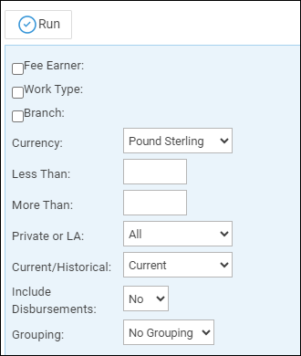 - Include Disbursements – Selecting Yes will produce additional columns to show the total disbursements per matter.