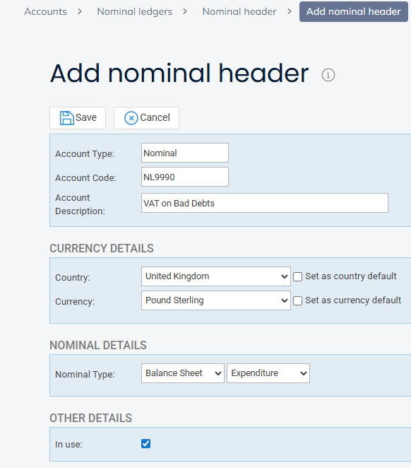 If a nominal does not already exist for this purpose, you will need to open one. The Nominal will be a balance sheet Expenditure and should not be excluded from VAT.