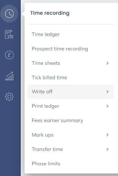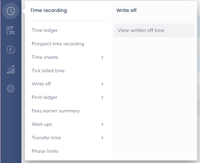 Time that has been written off can also be reinstated. To do so, select Time Recording > Write Off > View Time.